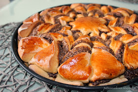 Faça cortes do centro até à extremidade, de modo que fique com 16 porções iguais, deixando um círculo no meio sem corte. Rode os triângulos 2 a 2 em sentidos opostos num total de 3 voltas.