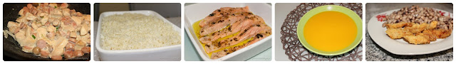 Domingo: Frango assado de domingo com palitos de batata doce e arroz branco; Creme de abóbora e cenouras assadas